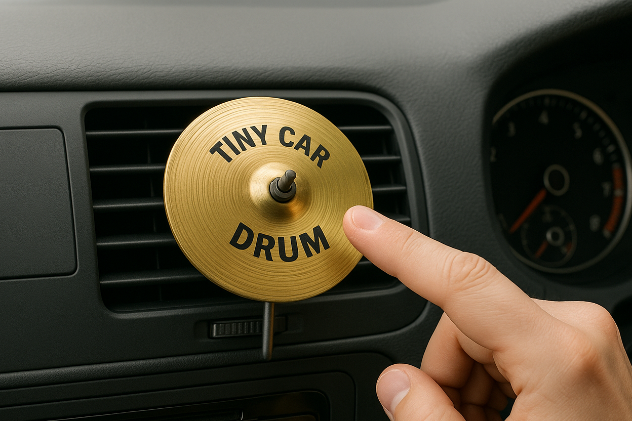 It’s a mini metal cymbal that clips onto your AC vent so you can drum your feelings instead of yelling at traffic.